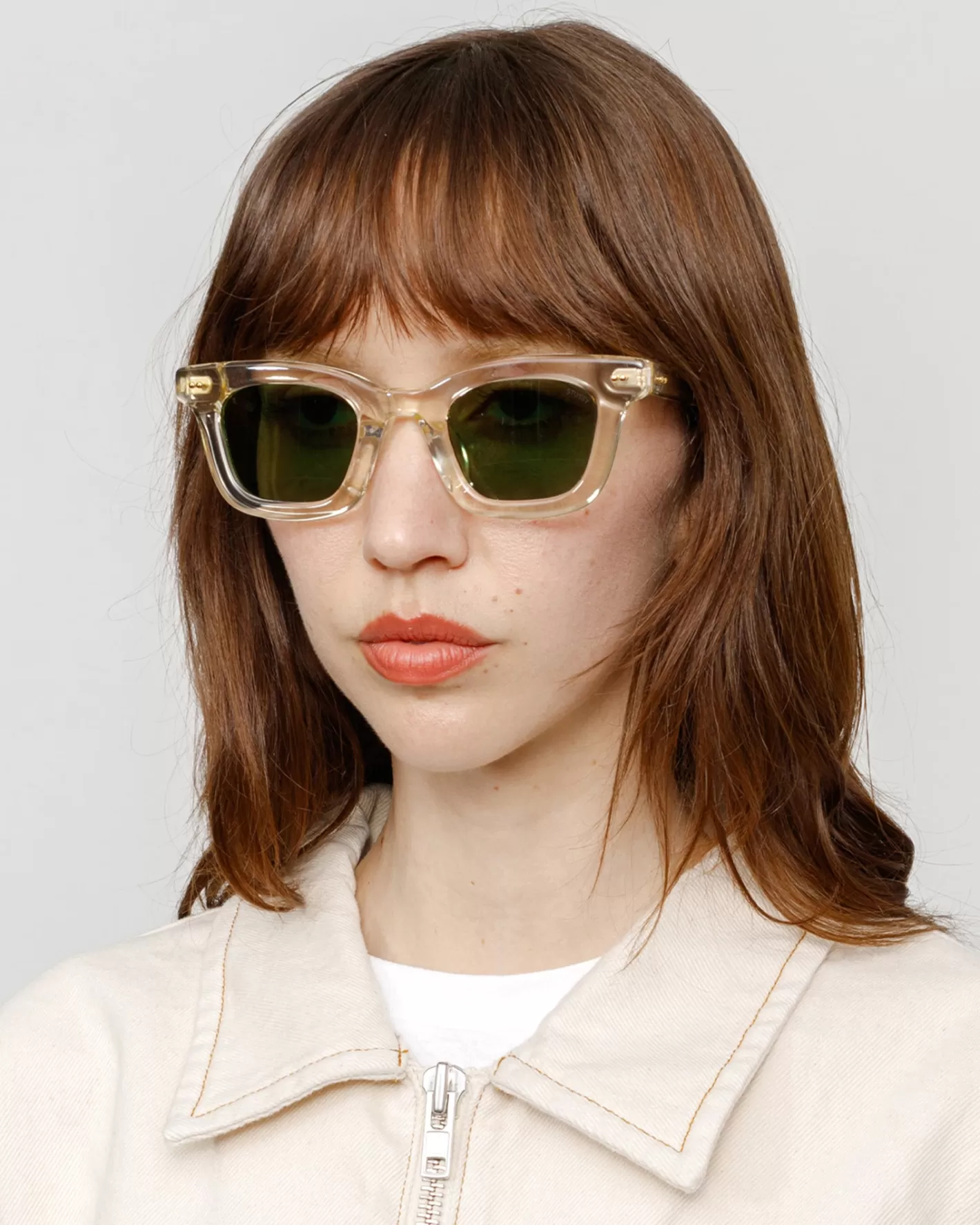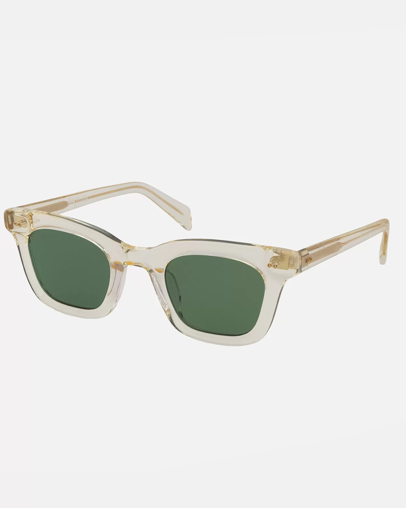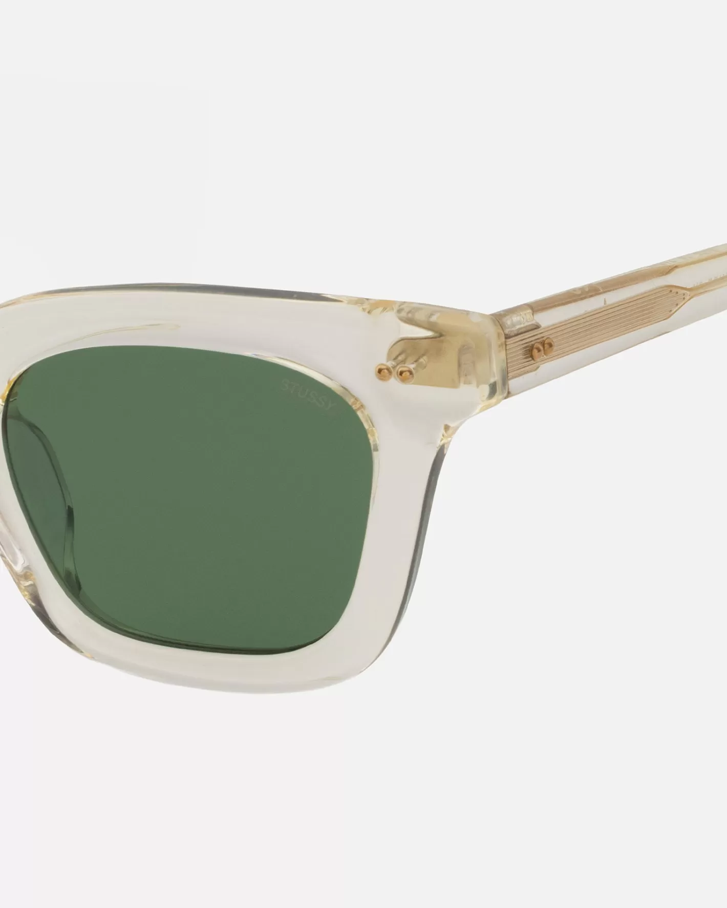 Acetate sunglasses with a squared frame, tinted lenses and gold metallic dome studs. Stüssy eyegear logo at the inside temple.