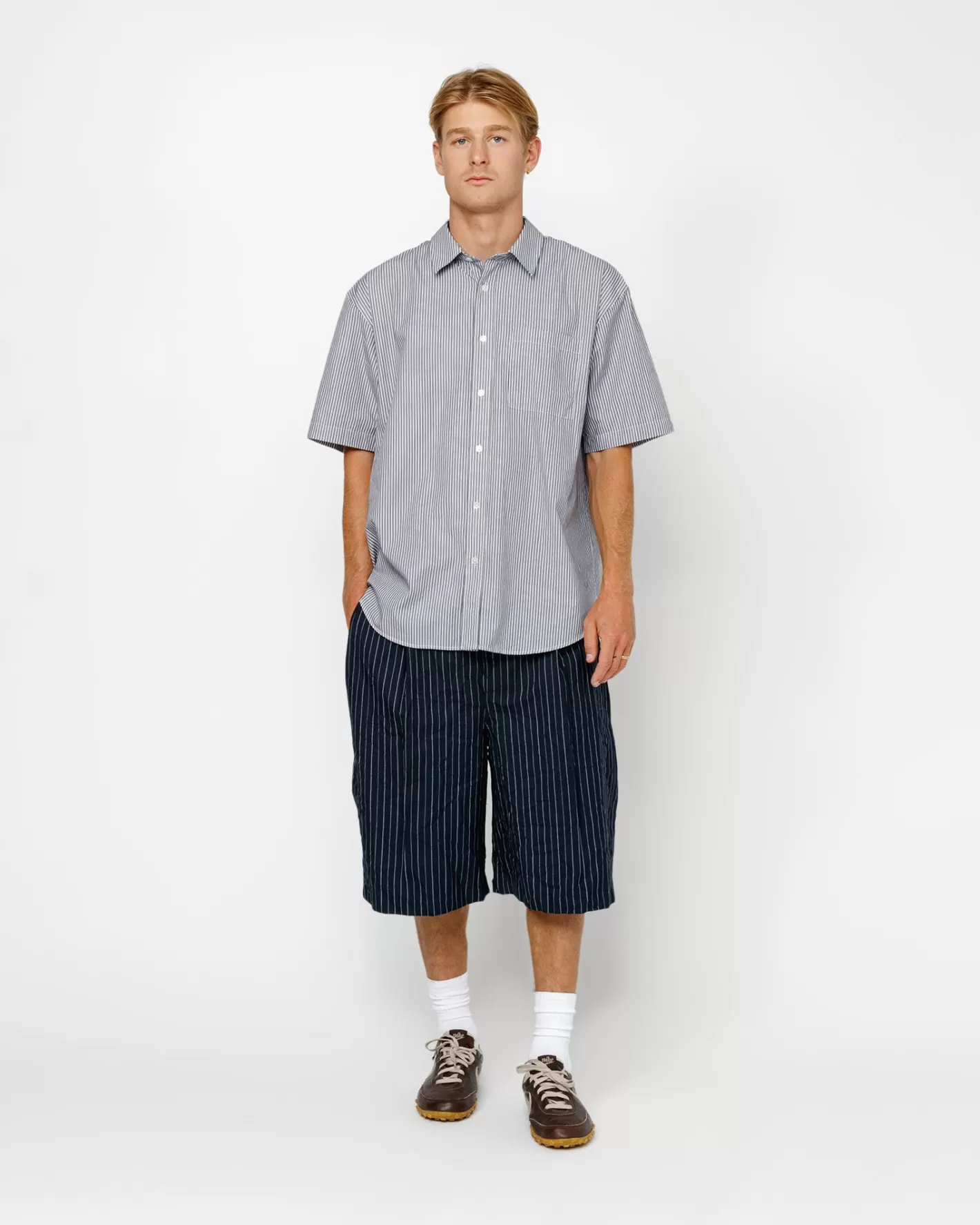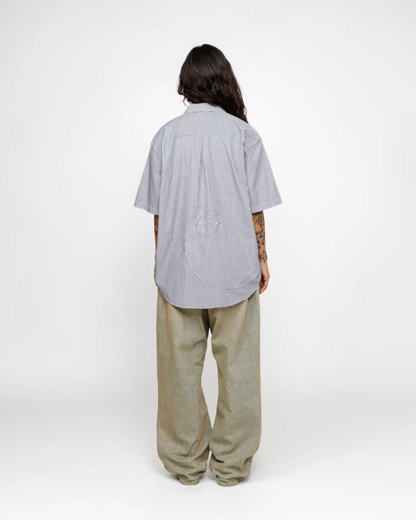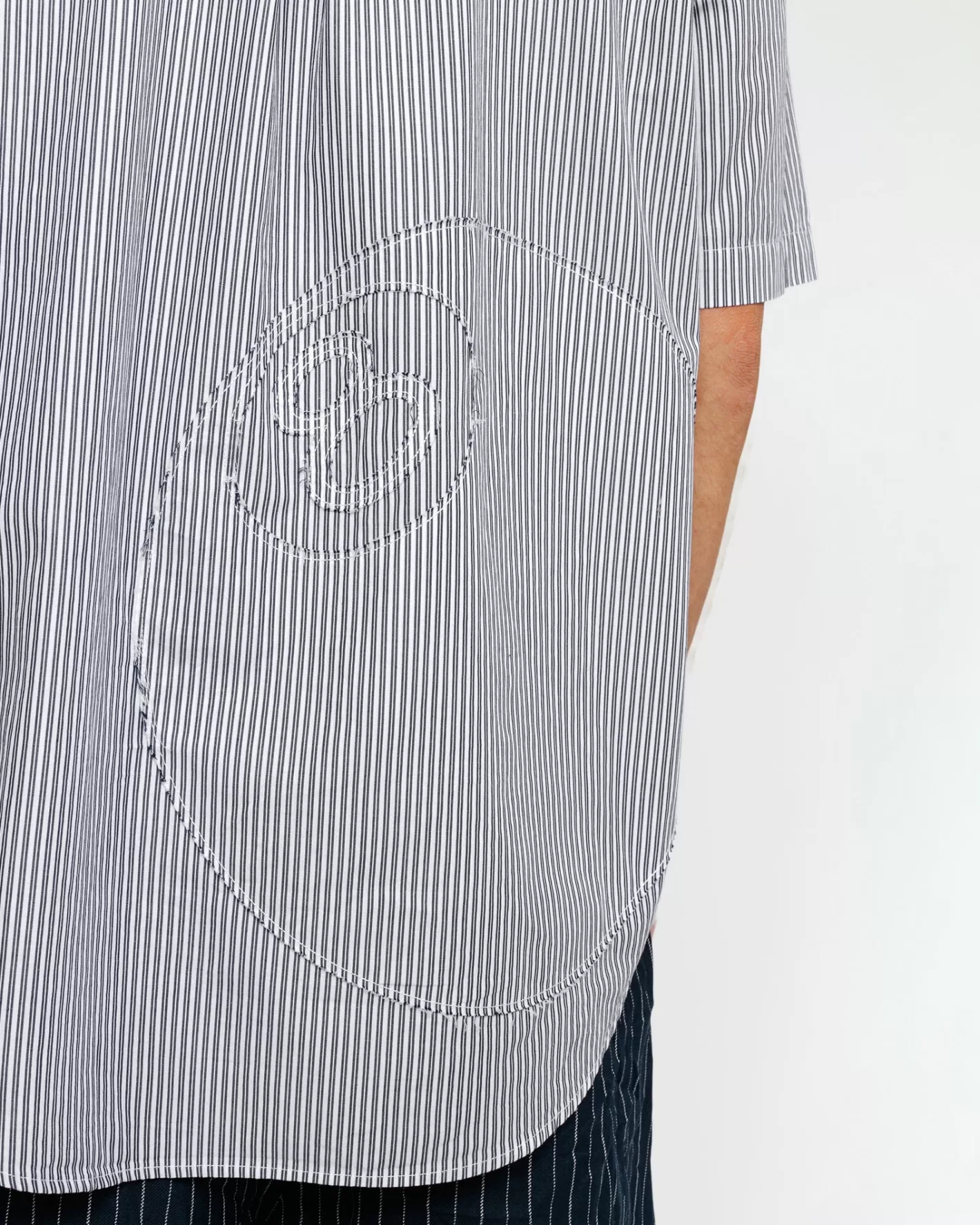 Boxy fit shirt in striped cotton poplin. Features a button closure, patch pocket and curved hem. Self-fabric 8 ball patch sewn at the back panel.