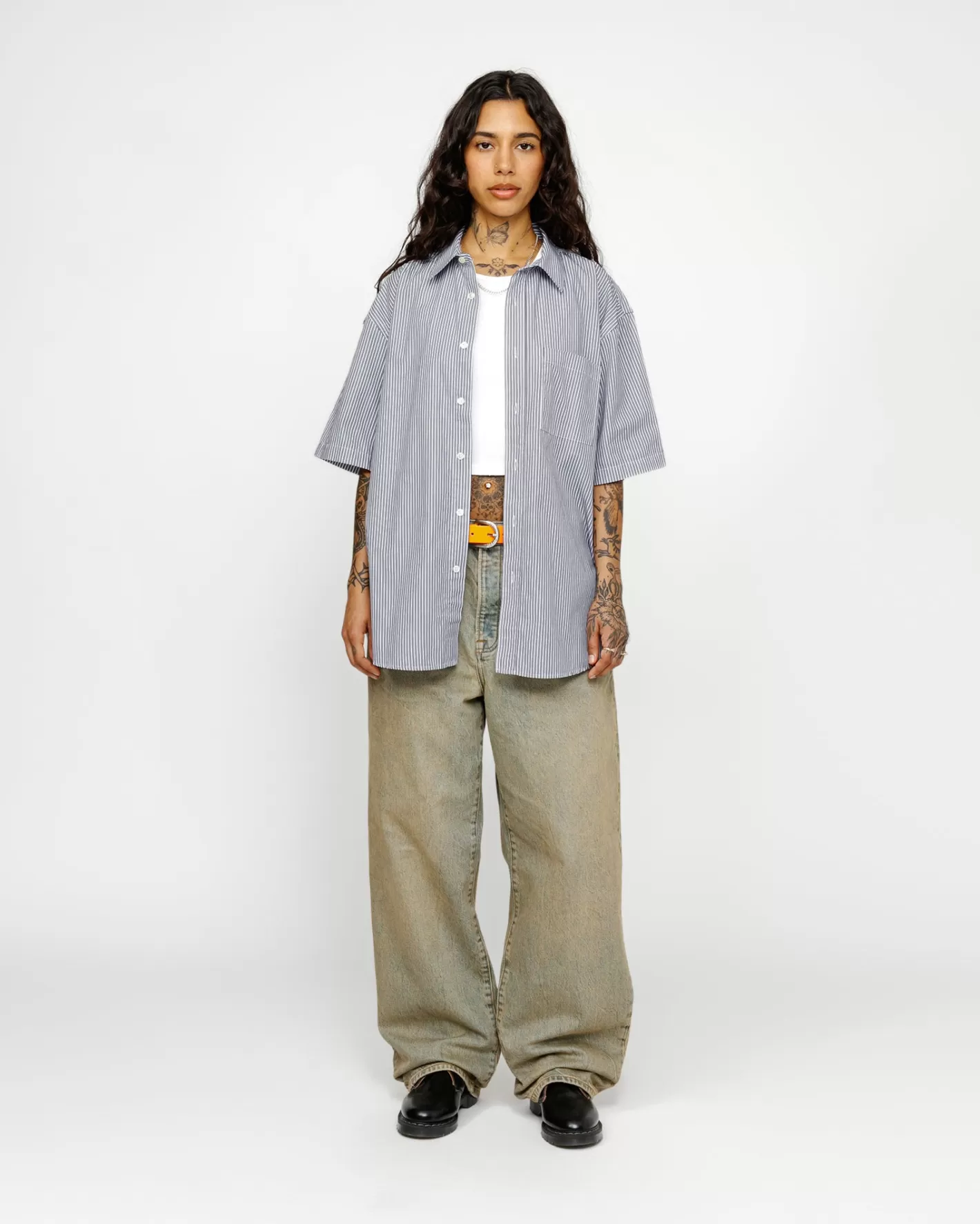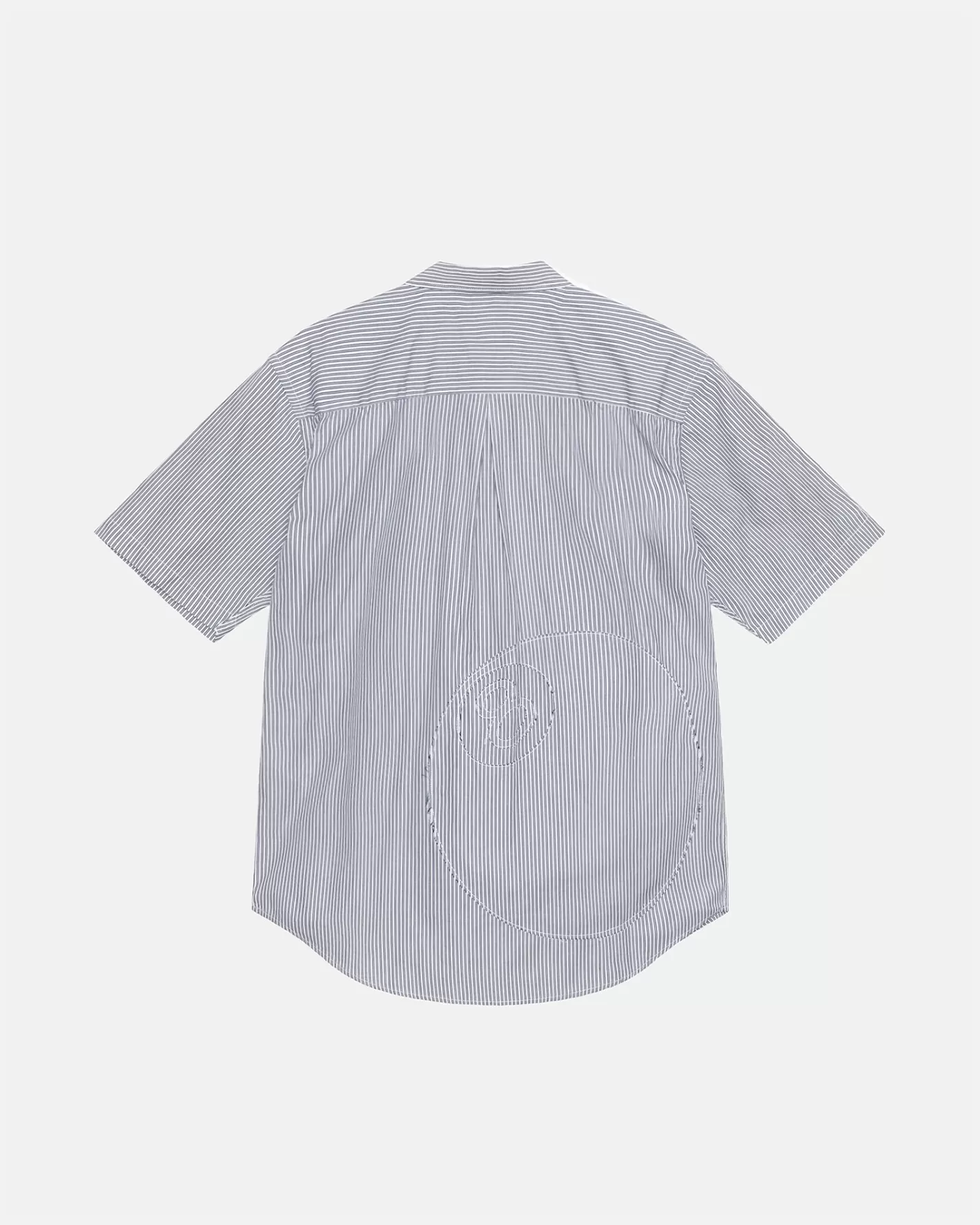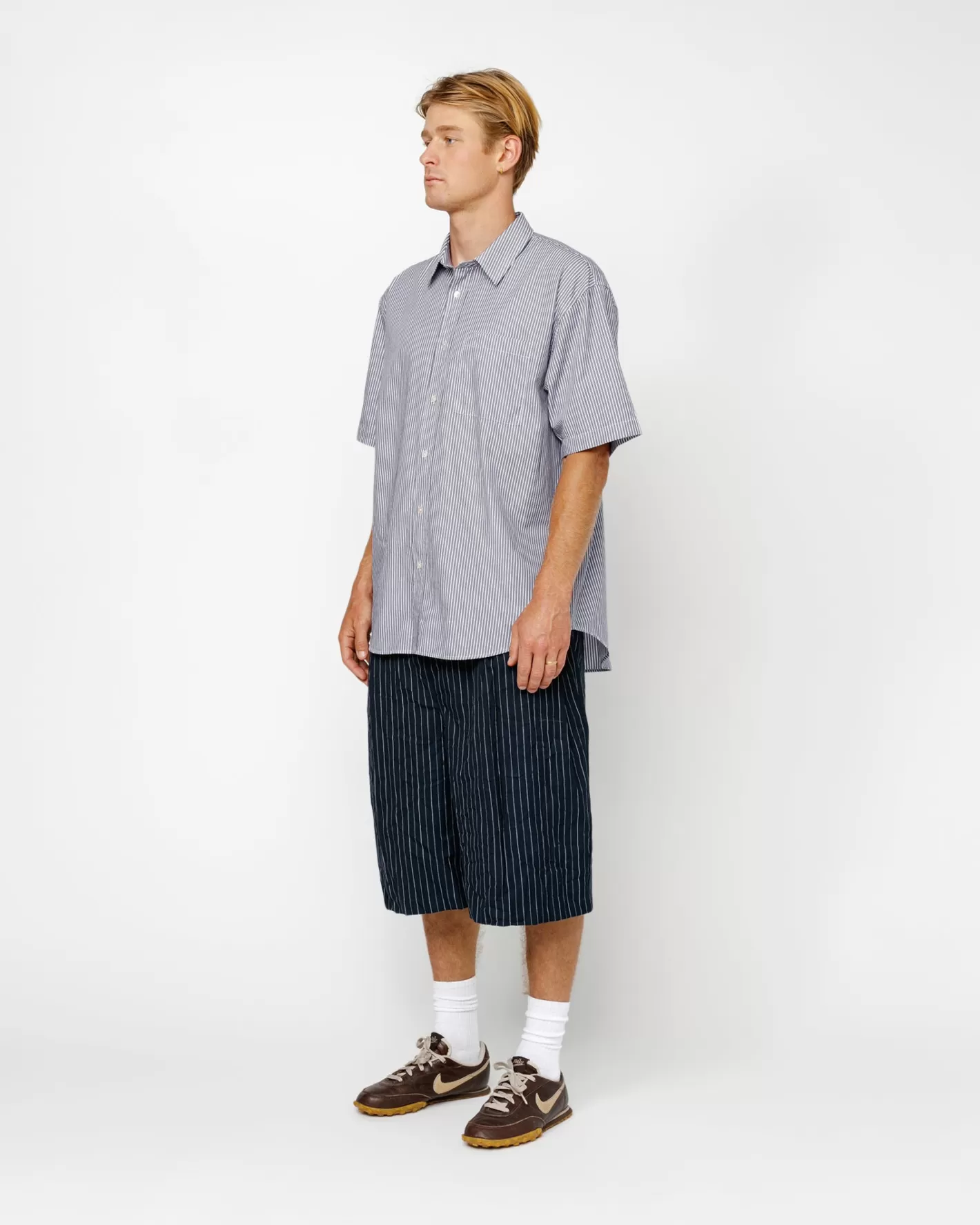 Boxy fit shirt in striped cotton poplin. Features a button closure, patch pocket and curved hem. Self-fabric 8 ball patch sewn at the back panel.