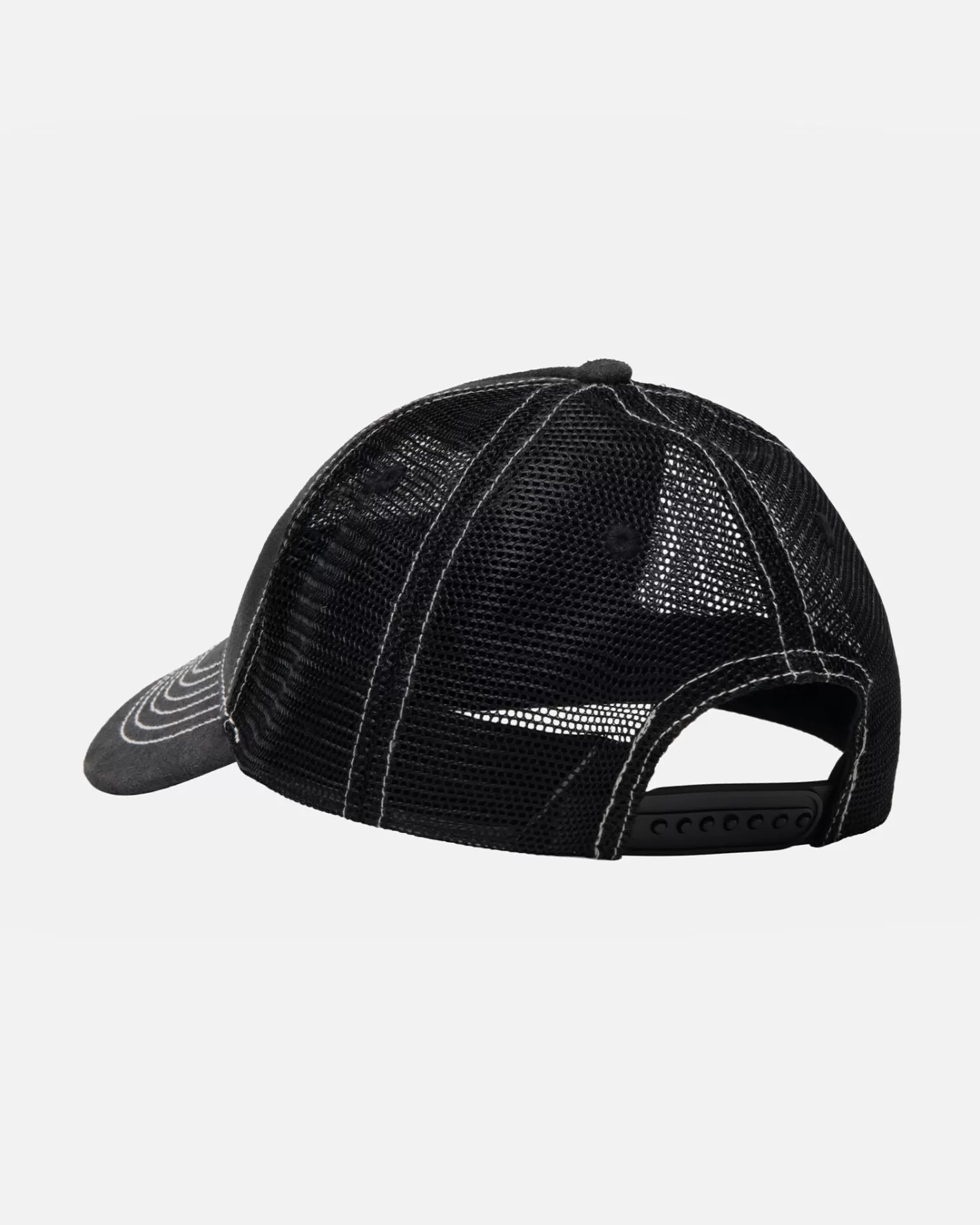 Low profile five panel trucker cap in distressed leather. Mesh cut out with Stüssy logo embroidery at the crown.
